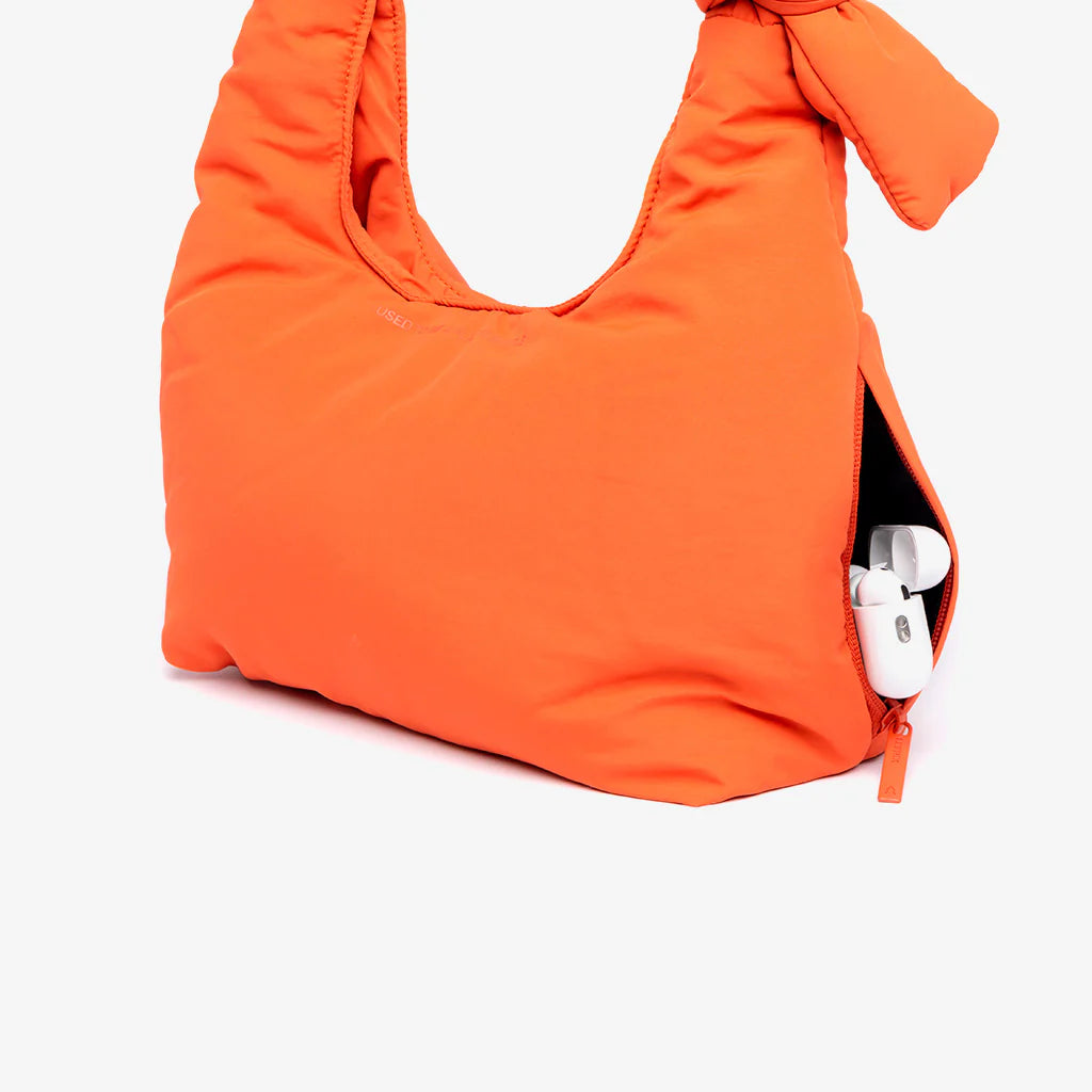 Mini version of our Biwa quilted bag. Designed to be used both as a shoulder bag and as a messenger bag, thanks to its adjustable sliding knots. Its 100% recycled fabric and soft quilting make it very light and pleasant to the touch.Large capacity main compartment and interior zipped pocket. Perfect for day or night.